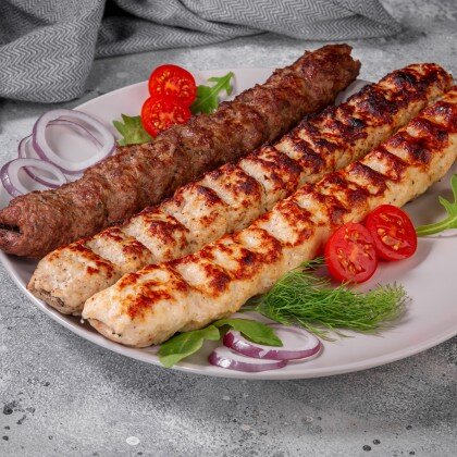 Шпажка свиная, свежие огурцы,свежие помидоры, красный лук с зеленью, четверть тандырной лепешки, соус "Скарлет" и "Бланко"
