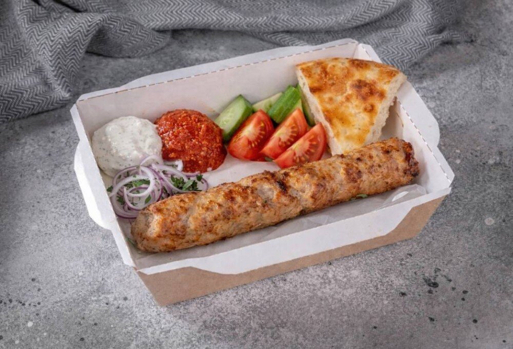 Люля из курицы, огурцы, помидоры, красный лук с зеленью, соус Скарлет и Бланко, тандырная лепешка