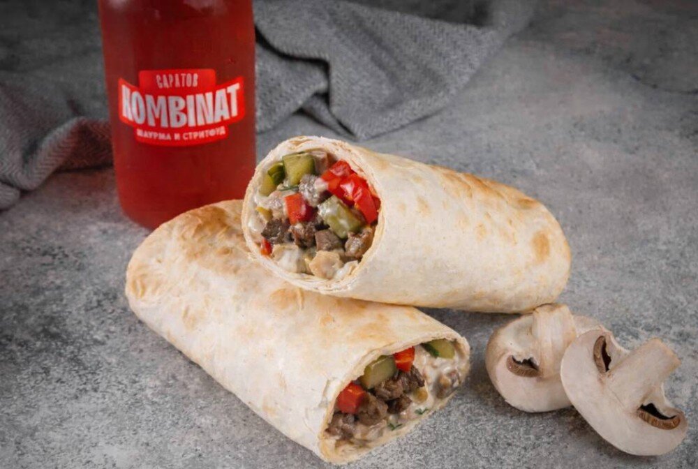 Тонкий лаваш, жареная говядина, свежие помидоры, картофель фри, соленые огурцы, луковые чипсы соус "Сметанно-грибной"