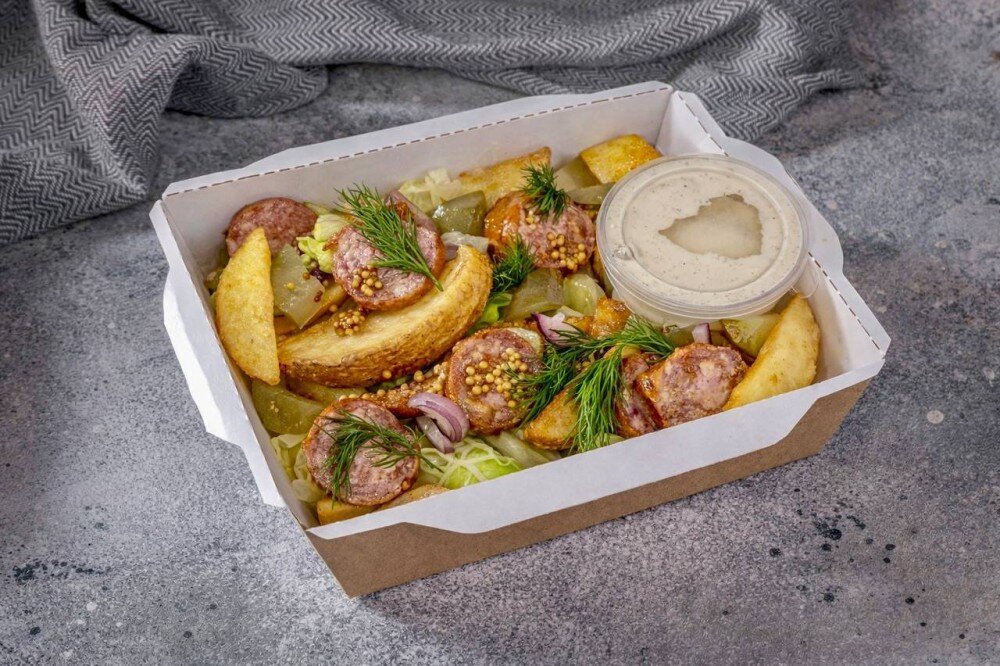 Салат айсберга, картофель запечённый, краковская колбаса,красный лук,горчица зернистая, соус Цезарь, огурец маринованный