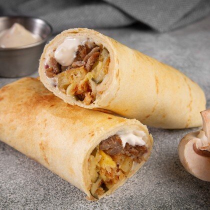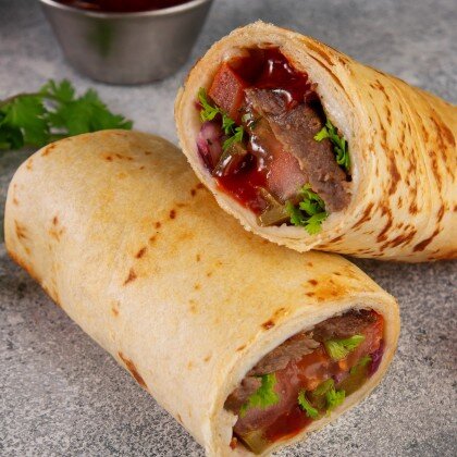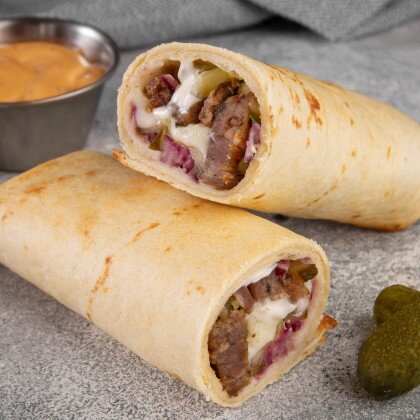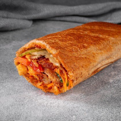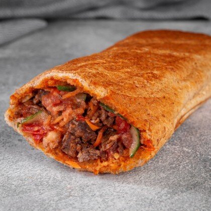 Пшеничный мягкий лаваш, говядина, маринованные огурцы, картофель фри, свежие помидоры, морковь по-корейски, соусы Скарлет и Бланко